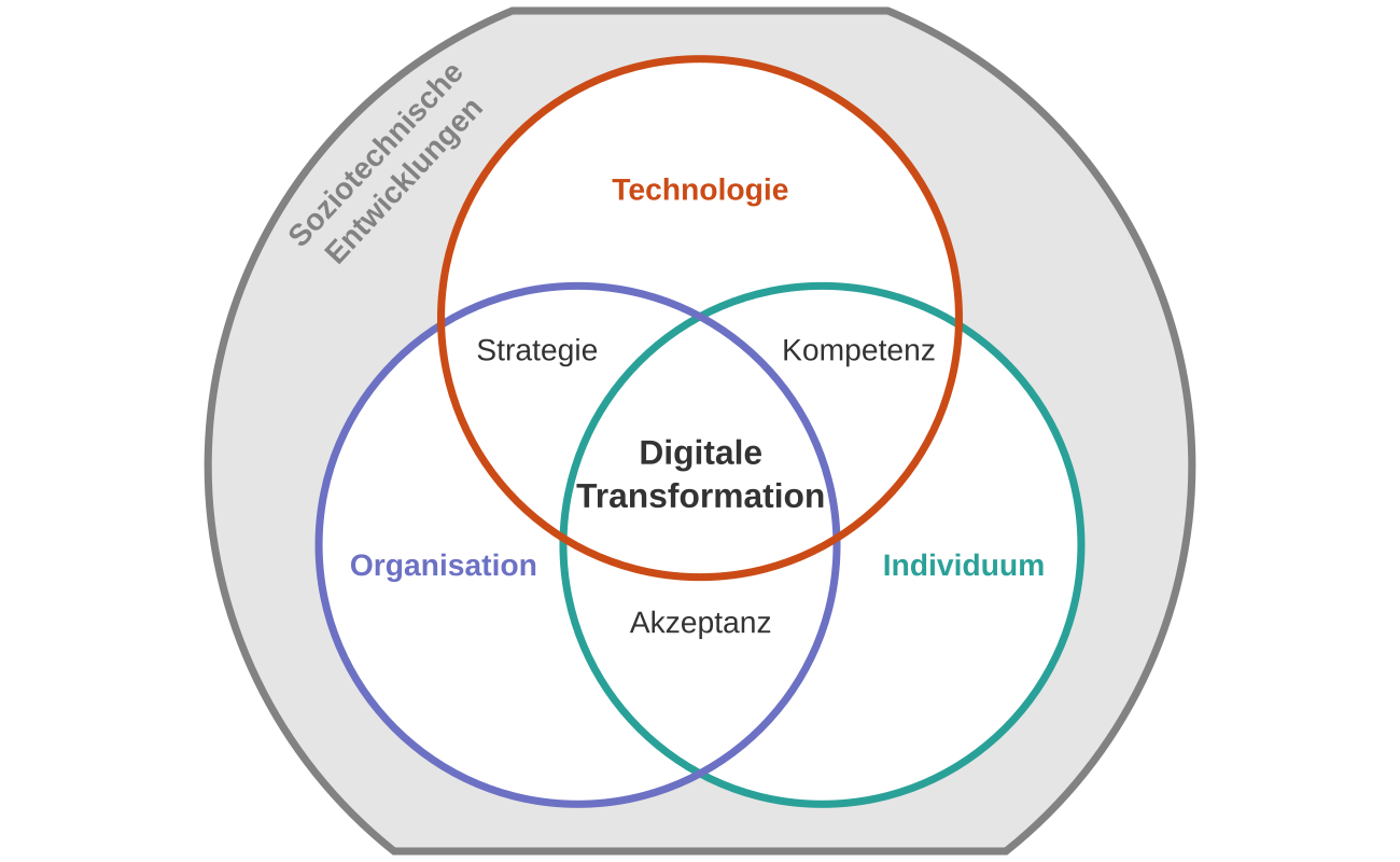 Der dargestellte Prozess vollzieht sich im Spannungsfeld der Organisation, der neuen Technologien und der Mitarbeitenden. Neue Technologien haben dabei der strategischen Ausrichtung und den Anforderungen der Organisation zu entsprechen. Mitarbeitende und Führung müssen die notwendigen Kompetenzen mitbringen oder erlernen, um mit neuen Technologien umgehen und sie gewinnbringend einzusetzen zu können. Die Organisation ihrerseits muss eine Kultur schaffen, welche bei den Mitarbeitenden Akzeptanz für Veränderungen schafft, insbesondere in Bezug auf die Einführung neuer Technologien und Arbeitsweisen.