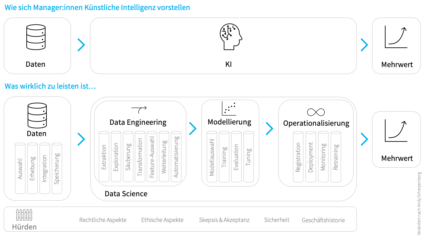 Abbildung 1. Sinnbild eines Missverständnisses: Wie die Managementebene sich Künstliche Intelligenz vorstellt (oben) und was die Data Scientists eigentlich einzubeziehen haben (unten). Darstellung verändert nach Andy Scherpenberg.