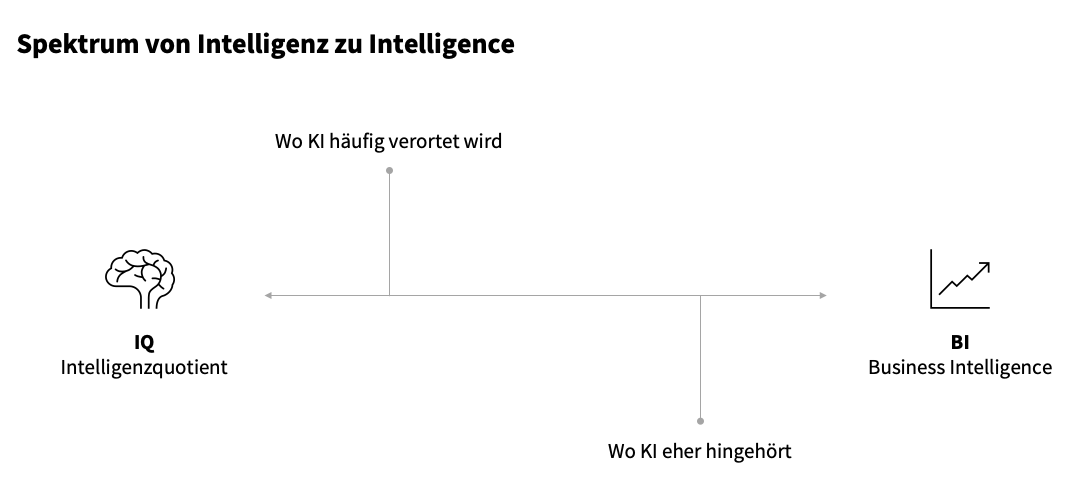 Im Gespräch mit Muttersprachlern, die technisch versiert sind und somit die vollumfängliche Tragweite der Thematik verstehen, haben wir eruiert, dass AI im englischsprachigen Raum auf einem Spektrum eher in der Nähe von Business Intelligence (BI) verortet wird (siehe Abbildung 2, rechts). KI wird im deutschsprachigen Raum wiederum eher in die Nähe von Intelligenz (links) gebracht, was der Technologie daher eher die Konnotation der Intelligenz mitgibt.